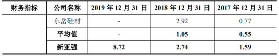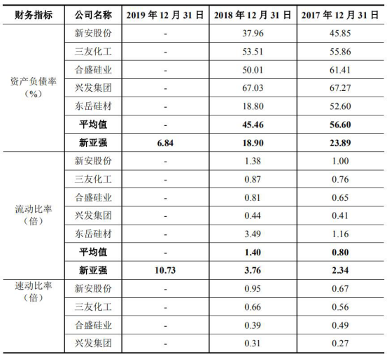 2016年至2018年,同行业可比公司——新安股份、三友化工、合盛硅业、兴发集团、东岳硅材的资产负债率均值为59.28%、56.60%、45.46%,流动比率均值为0.59、0.80、1.40,速动比率均值为0.40、0.55、1.55。