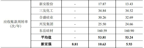 公司的应收账款周转率低于同行业可比上市公司平均水平。新亚强称,主要原因为同行业可比上市公司均为国内大型有机硅生产企业,新安股份、三友化工、合盛硅业、兴发集团、东岳硅材企业规模明显大于公司,其在面对下游客户时,具有更多的话语权,特别是信用政策方面,三友化工、兴发集团、东岳硅材均是公司的主要供应商,各家给予公司的信用政策均为交易发生的当月结清款项,基本没有账期;公司的下游客户主要为美国迈图集团等长期稳定客户,公司均给予一定的账期。