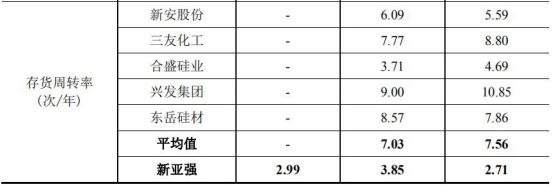 公司的存货周转率低于同行业可比上市公司,新亚强称,主要因为同行业可比上市公司的产品结构中有机硅产品销售占比10%至 50%不等,公司的产品均为有机硅产品,产品结构具有较大差异;公司的主要原材料三甲基氯硅烷是大型有机硅单体生产企业的副产品,市场供应存在一定的波动性,公司设定的原材料的安全库存指标略高;公司部分国内客户存在下单与要求发货时间间隔较短的情况,为保证交货的及时性,公司设定的产成品的安全库存指标略高;各公司存货管理政策不尽相同。