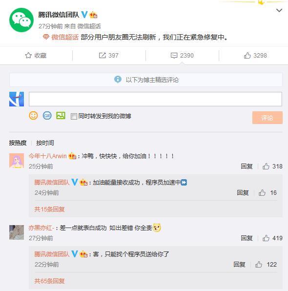 此后不久,腾讯微信团队在官方微博回应称,“部分用户朋友圈无法刷新,我们正在紧急修复中。”对此,有网友调侃:“差一点就表白成功,如出差错,你全责。”截至发稿,腾讯微信团队未就修复情况进一步通报。