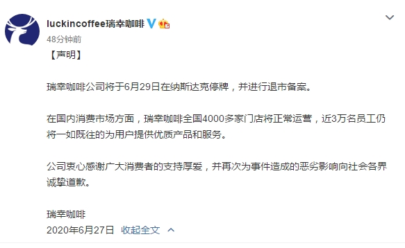6月27日消息,瑞幸咖啡发布声明称,公司将于6月29日在纳斯达克停牌,并进行退市备案。同时,瑞幸咖啡全国4000多家门店将正常运营。