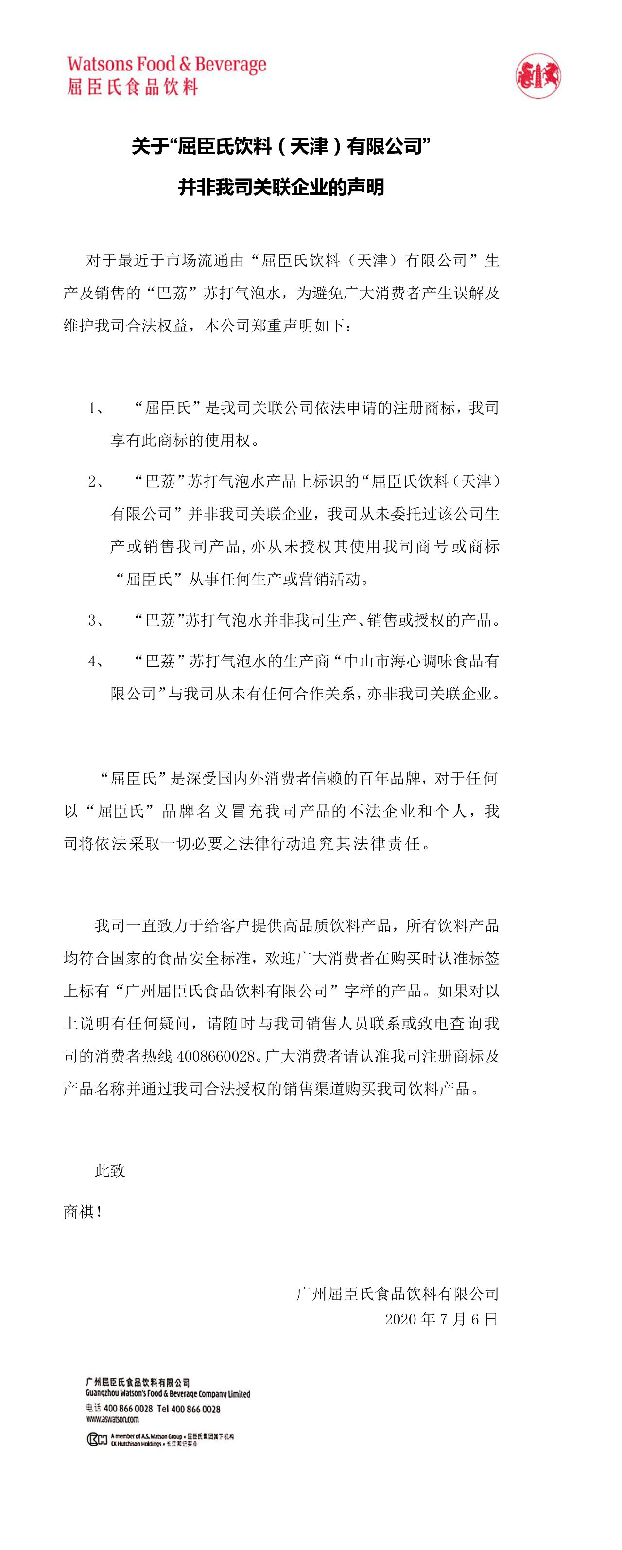 声明中称,市场流通的“巴荔”苏打气泡水,并非屈臣氏食品饮料生产、销售或授权的产品;该产品上标识的“屈臣氏饮料(天津)有限公司”并非屈臣氏食品饮料关联企业,屈臣氏食品饮料从未委托过该公司生产或销售屈臣氏产品,亦从未授权其使用屈臣氏商号或商标“屈臣氏”从事任何生产或营销活动;该产品生产商“中山市海心调味食品有限公司”与屈臣氏食品饮料从未有任何合作关系,亦非屈臣氏食品饮料关联企业。