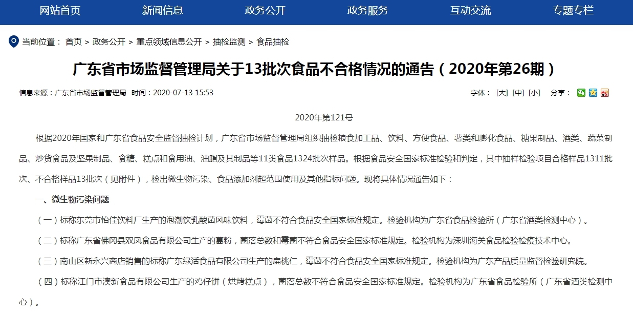 据悉,广东省市场监督管理局已要求辖区市场监管部门及时对不合格食品及其生产经营者进行调查处理,责令企业查清产品流向,采取下架、召回不合格产品等措施控制风险,并分析原因进行整改。同时要求辖区市场监管部门将相关情况记入生产经营者食品安全信用档案,并按规定在监管部门网站上公开相关信息。