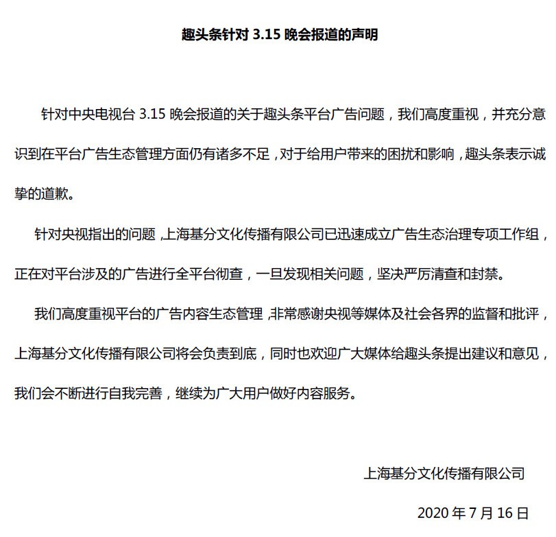 16日晚间,央视财经2020年“3·15”晚会曝光趣头条广告藏猫腻,趣头条屡现违规广告,将赌博广告包装成“网络赚钱”。趣头条方面紧急回应称,针对央视指出的问题,上海基分文化传播有限公司已迅速成立广告生态治理专项工作组,正在对平台涉及的广告进行全平台彻查,一旦发现相关问题,坚决严厉清查和封禁。