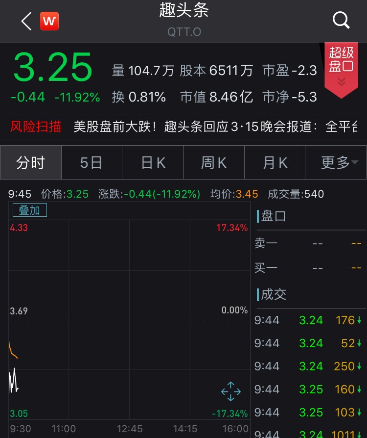 被央视财经3·15晚会点名后,趣头条股价盘前直线跳水,一度跌近20%。截至发稿,趣头条报3.25美元/股,跌11.92%,总市值不足9亿美元。