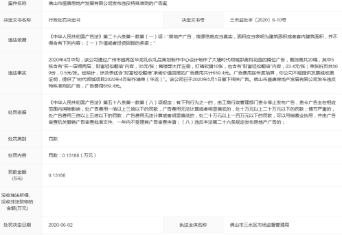 近日,佛山市三水区市场监督管理局对佛山市盛唐房地产发展有限公司(以下简称“佛山盛唐地产”)发布违反特殊准则的广告案作出行政处罚,对其罚款1318.8元。行政处罚决定文书文号:三市监处字[2020]6-10号。记者查询发现,佛山盛唐地产为广州市时代控股集团有限公司(以下简称“时代地产”)旗下子公司。