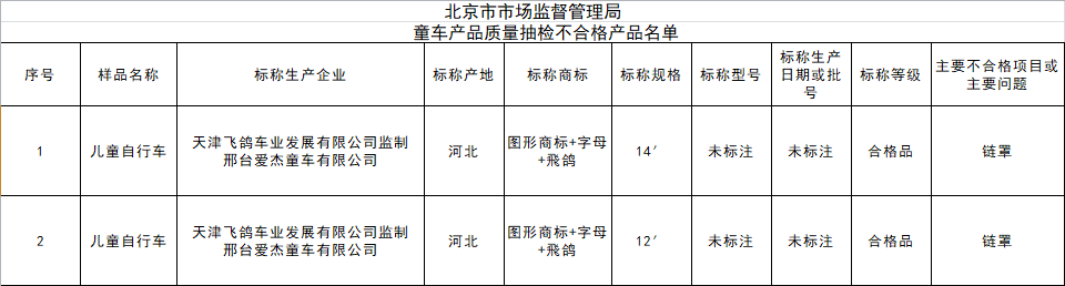 据北京市市场监督管理局今日发布的“童车产品质量抽检结果公示”显示,由飞鸽监制生产的两款儿童自行车链罩不合格。