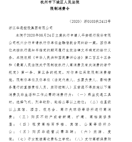 中国执行信息公开网发布《杭州市下城区人民法院限制消费令(2020)浙0103执2413号》显示,2020年6月24日,杭州市下城区人民法院立案执行了申请人平安银行股份有限公司杭州分行申请执行华通控股金融借款合同纠纷一案。