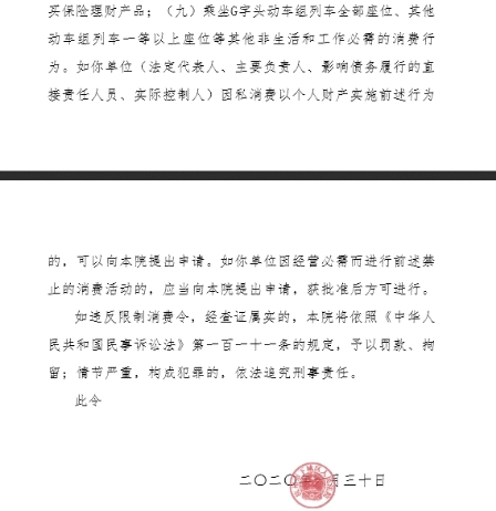 限制消费令称,因私消费以个人财产实施前述行为的,可以向杭州市下城区人民法院提出申请。如华通控股因经营必需而进行前述禁止的消费活动的,应当向杭州市下城区人民法院提出申请,获批准后方可进行。如违反限制消费令,经查证属实的,杭州市下城区人民法院将依照《中华人民共和国民事诉讼法》第一百一十一条的规定,予以罚款、拘留;情节严重,构成犯罪的,依法追究刑事责任。