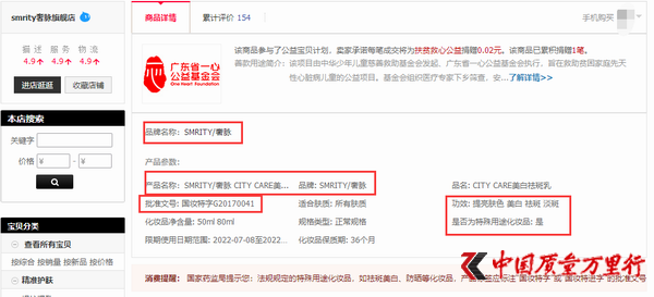 业内人士称,特殊用途化妆品是一证一批文,并需要注明批准文号。查询药监局官网不难发现,“国妆特字G20170041”备案的产品名称为“City Care美白祛斑乳”,生产企业为佳宁化妆品(福州)有限公司。“天猫旗舰店按规定只能销售品牌方的产品,smrity奢脉天猫旗舰店严格意义上是不能销售‘City Care’品牌的产品。更为重要的是,奢脉美白祛斑乳根本没有取得特殊化妆品的生产批文,套用‘City Care美白祛斑乳’的特证并不合规。”