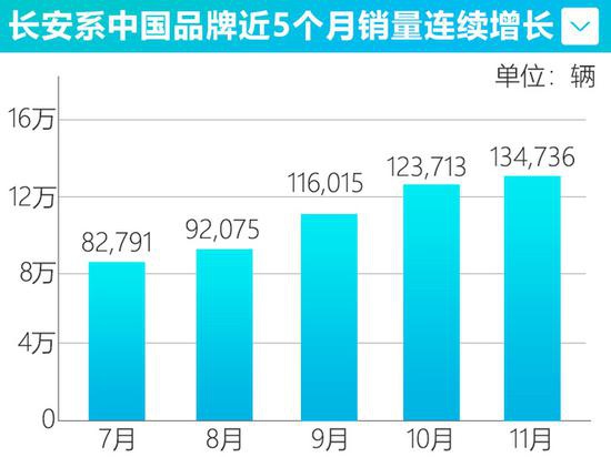 长安自主品牌今年累计销量已突破113万台,,自今年7月起连续4个月环比增长,同时也创造了近半年来的月销新高。这得益于旗下产品的集体“爆发”,CS75今年11月销售27,220辆,在SUV市场仅次于“神车”哈弗H6,同比、环比增长分别达到126.2%和8.1%;CS35销售15,994辆,跻身国内SUV销量榜前15位,同比、环比增幅分别为25.4%和19.9%;CS55销售10,925辆,环比增长51.6%;逸动销售10,102辆,同比、环比增长分别为8.1%和10.7%。