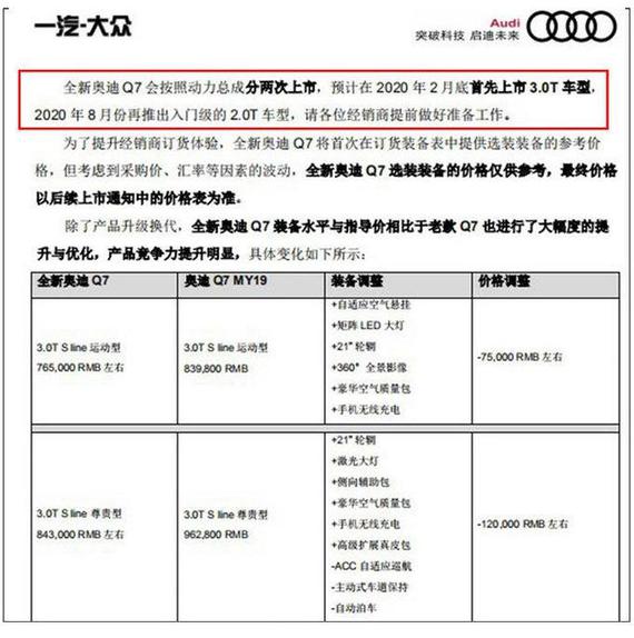 近日,互联网上流传的一张疑似新款奥迪Q7售价单图片火了。根据图片显示,新款奥迪Q7或将于2020年2月底正式上市,先期推出3.0T S Line运动型和3.0T S Line尊贵型两款车型,售价或为76.50-84.30万元。与此同时,资料还显示新款Q7的2.0T版本将于8月正式推出。而且相较于现款车型,新款Q7在价格上有着非常大幅度的下调,最高降幅在12万元左右,但具体真假尚未得到有效证实。