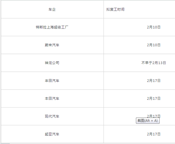 部分车企复工表