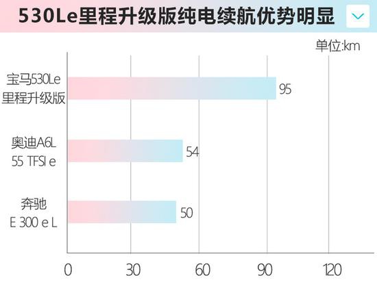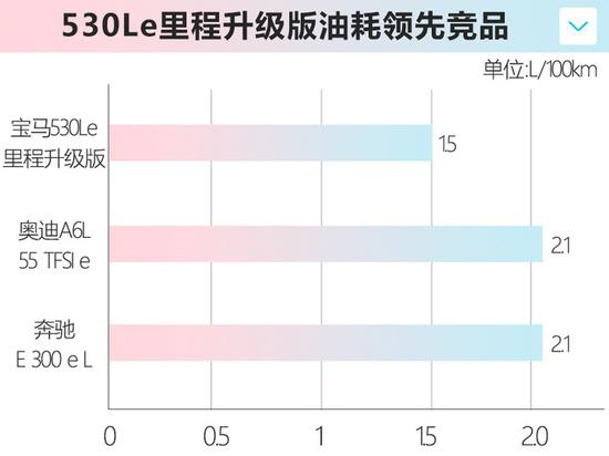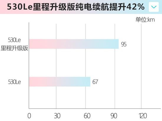 宝马530Le里程升级版车身尺寸与老款车型保持一致,动力上新车沿用2.0T插电混动系统,综合最大功率为185kW,综合峰值扭矩为420N.m,其中发动机最大功率为135kW。电池与续航方面,530Le里程升级版电池容量由老款的13kWh提升至17.7kWh,纯电续航里程也相应的由67km提升至95km,每百公里综合油耗低至1.5L(老款为1.6L)。