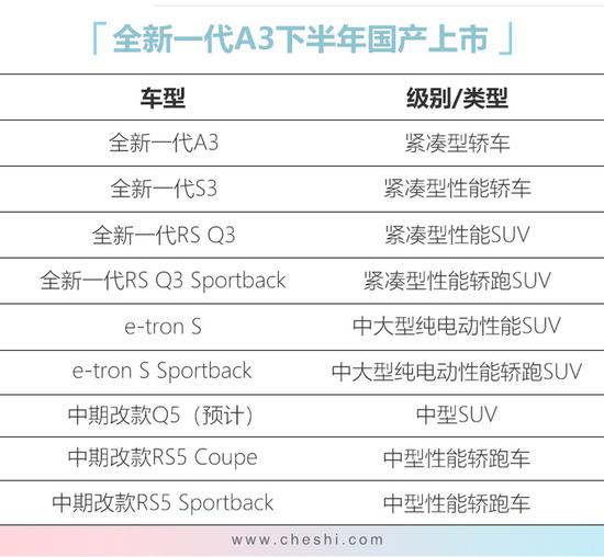 2020年日内瓦车展将在3月3日正式开幕,本届车展奥迪预计将会带来全新一代A3、全新一代S3、全新一代RS Q3系列、e-tron S系列、中期改款Q5以及中期改款RS5系列共计9款新车。其中全新一代A3、S3会迎来全球首发,国内消费者更加关心的国产A3两厢、三厢长轴距车型有望在北京车展亮相(原计划4月23日开幕的北京车展已经确认延期举办),预计新车将在今年下半年正式上市。