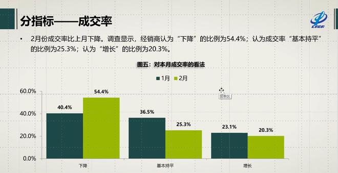 从成交率分指标来看,2月成交率比上月下降,调查显示,经销商认为“下降”的比例为54.4%,认为成交率“基本持平”的比例为25.3%,认为“增长”的比例为20.3%。