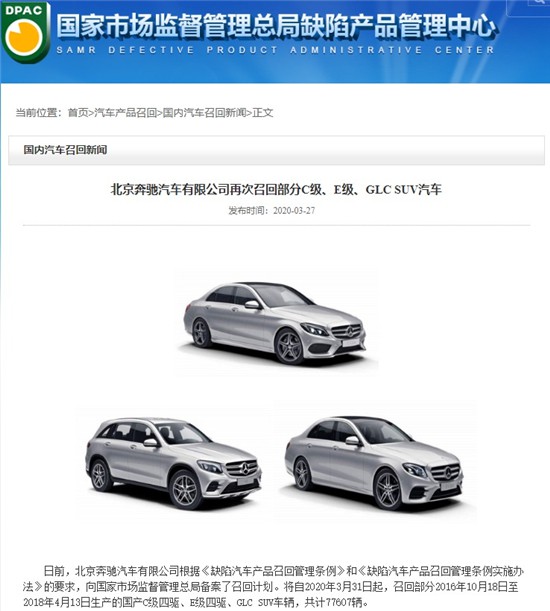 接下来,奔驰将自2020年3月31日起,召回共计77607辆国产C级四驱、E级四驱、GLC SUV。