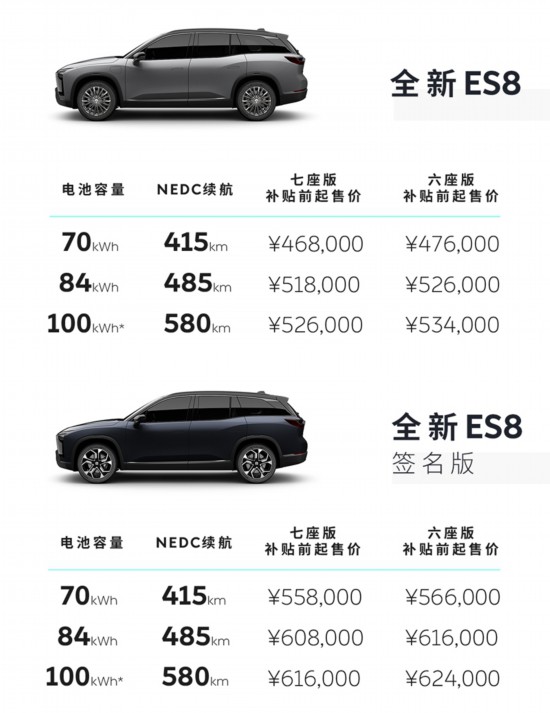 2020款ES8配备70kWh电池组车型的NEDC续航达415km的,84kWh电池组车型NEDC续航达485km。同时,新增100kWh电池组车型的NEDC续航里程更是高达580km。