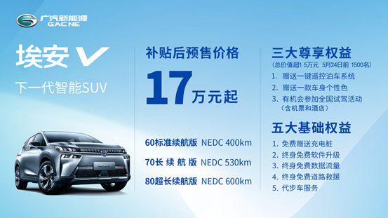 4月27日,广汽新能源埃安系列最新车型以“云预售”的形式全球首发。广汽新能源古惠南总经理通过网络在线宣布:“下一代智能SUV命名为埃安V,将推出60标准续航版、70长续航版和80超长续航版三个版本,其NEDC续航分别达到400km、530km及600km,补贴后预售价格17万元起。”