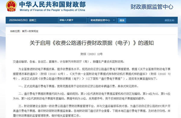 人民网北京4月29日电(王紫)29日,财政部于官网发布《关于启用<收费公路通行费财政票据(电子)>的通知》(以下简称“通知”)称,正式启用通行费电子票据。使用范围适用于征收政府还贷公路的车辆通行费。