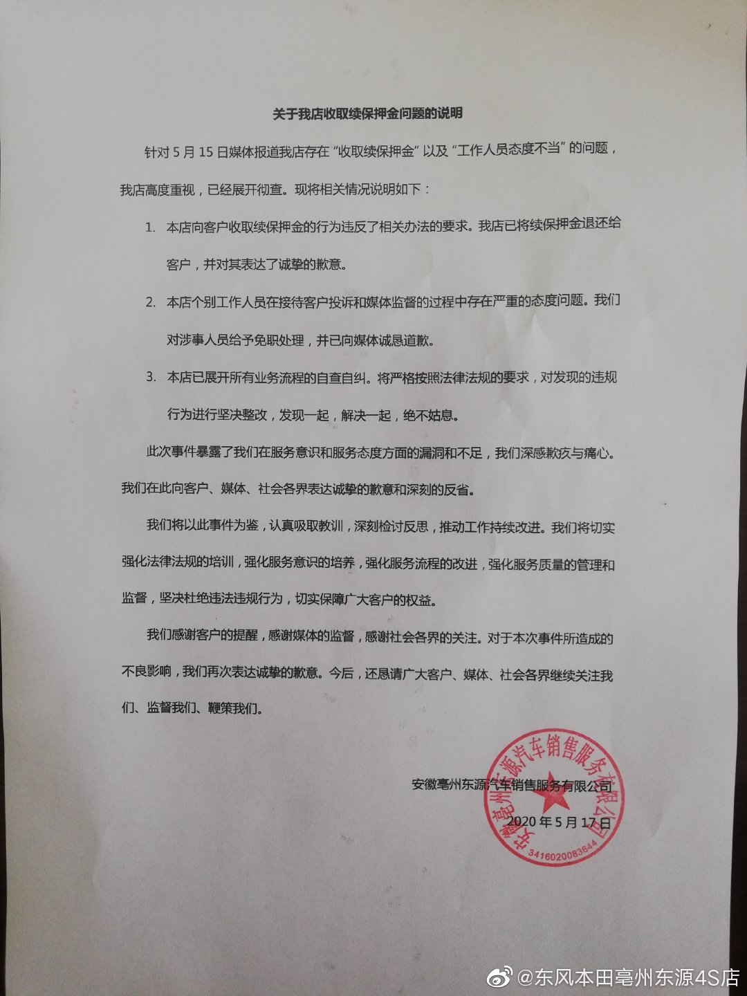 5月17日晚,东风本田亳州东源4S店回应向客户收取续保押金一事,称该行为违反了相关办法的要求,已将续保押金退还给客户并致歉,对涉事人员给予免职处理。