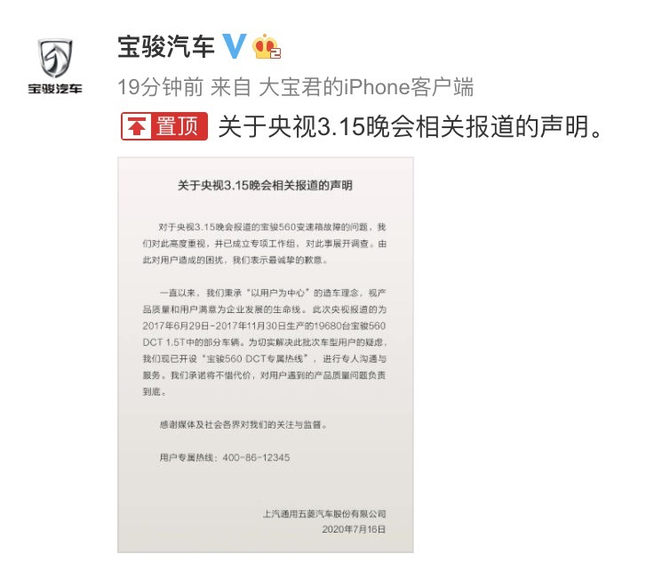 今天,315晚会曝光宝骏560高速上突然失去动力,故障没完没了投诉无处可去。当晚21点22分,宝骏汽车官方微博回应称:对于央视3·15晚会报道的宝骏汽车560变速箱故障的问题,我们对此高度重视,并已成立专项工作组,对此事展开调查,现已开设“宝骏560 DCT专属热线”,由此对用户造成的困扰,表示最诚挚的歉意。