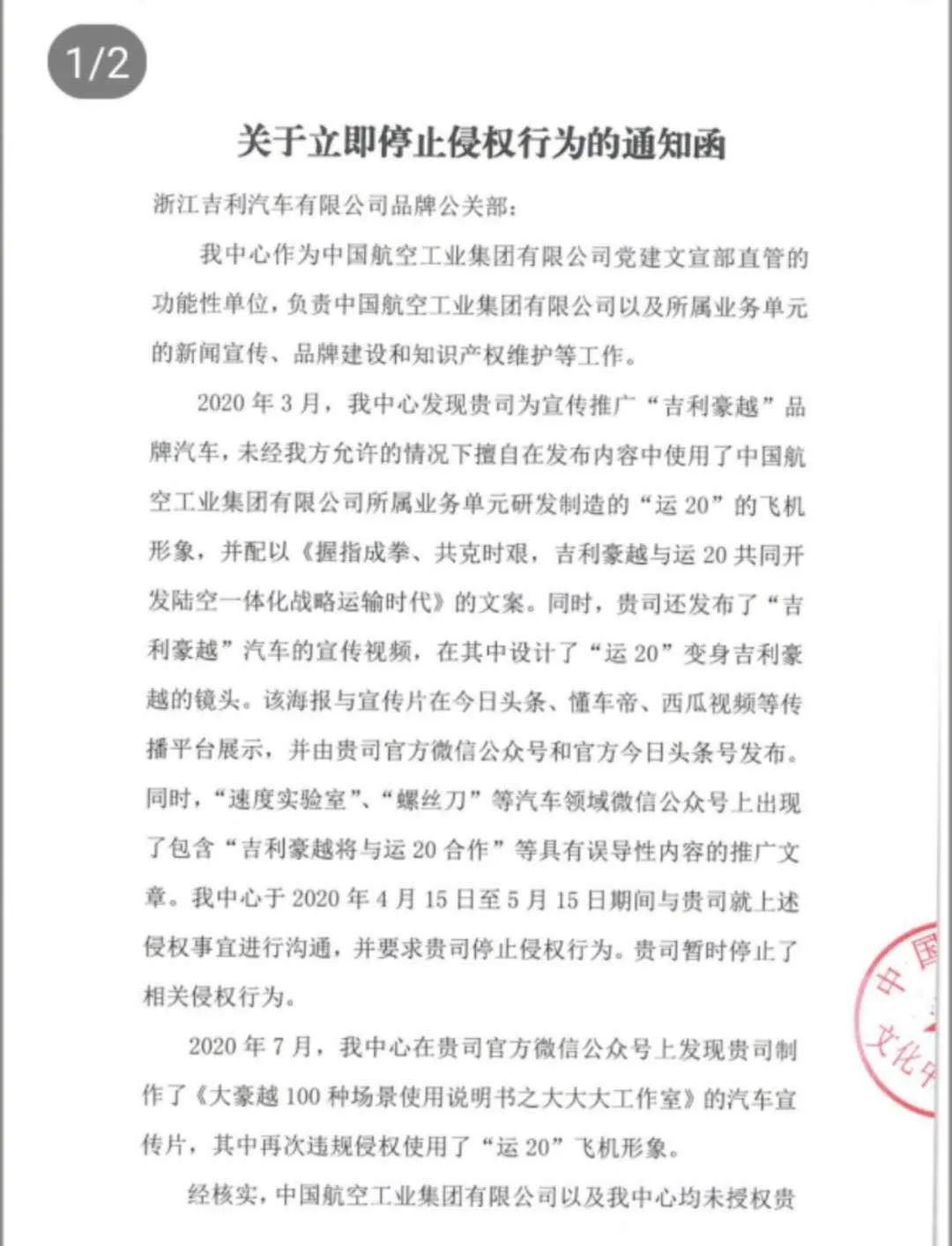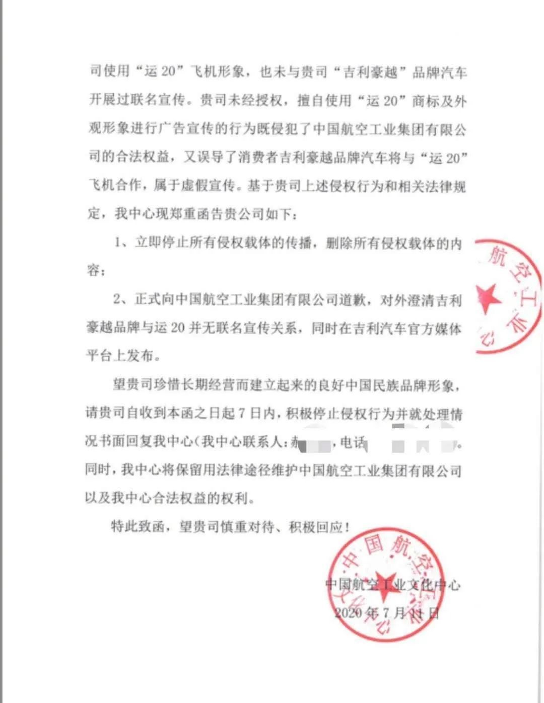 近日,网络上流传出一张中国航空工业文化中心要求吉利汽车立即停止侵权行为的通知函。函中称,今年3月和7月,吉利汽车在“吉利豪越”车型的广告宣传中,在未经中国航空工业集团和中国航空工业文化中心授权的情况下,擅自使用“运-20”军用大型运输机形象及商标,并联合部分自媒体账号在各新媒体平台刊登具有误导性的内容,进行虚假宣传,侵犯了中国航空工业集团的合法权益。