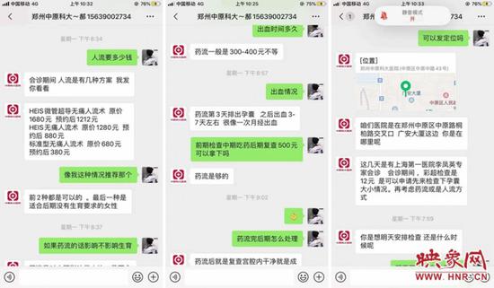 12月12日,18岁的陈某向映象网反映,他与女朋友亲热没做好防范措施,不小心让女朋友怀孕了。因为两人都才18岁,不可能现在要孩子,就想做一个人流手术。陈某在网上百度搜索,网页上有一家医院“中原科大医院”。点开页面后,上面有联系方式,可以加微信进行聊天。在微信中,医院的工作人员推荐了三种手术方式:HEIS微管超导无痛人流术,原价1680元,预约后1212元;HEIS无痛人流术,原价1280元,预约后880元;标准型无痛人流手术原价680元,预约后380元。因为现在岁数还小,没有工作,手里根本没钱,陈某就想选择最便宜的预约后380元的标准型无痛人流手术。在微信中,陈某还询问这种手术影响不影响以后生育,确定安全后,陈某再次询问这种手术前期检查中期吃药后期复查500元可以拿下吗,对方回复称“够的”。
