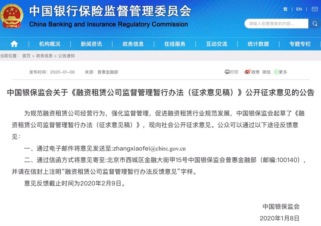 为规范融资租赁公司经营行为,强化监督管理,促进融资租赁行业规范发展,中国银保监会起草了《融资租赁公司监督管理暂行办法(征求意见稿)》,现向社会公开征求意见。公众可以通过以下途径反馈意见: