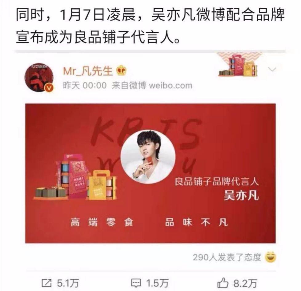 1月7日,良品铺子在深圳举办“匠心12年引领高端”的高端零食成果发布会,良品铺子正式官宣吴亦凡成为品牌最新代言人。