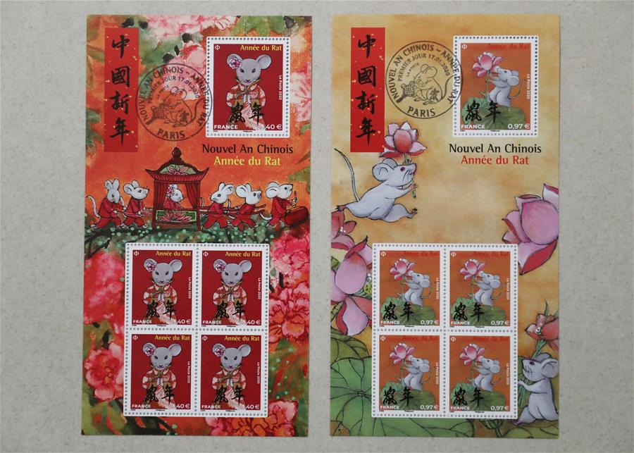 为迎接中国农历新年,法国邮政公司发行两枚中国农历鼠年生肖邮票。鼠年生肖邮票由法籍华裔画家陈江洪设计。两枚邮票的上方和下方分别为法文和中文“鼠年”字样。其中一枚邮票的图案是一只老鼠手捧荷花,寓意和和美美;另一枚邮票以中国民间故事老鼠娶亲为主题,刻画了一只头戴鲜花的老鼠新娘。