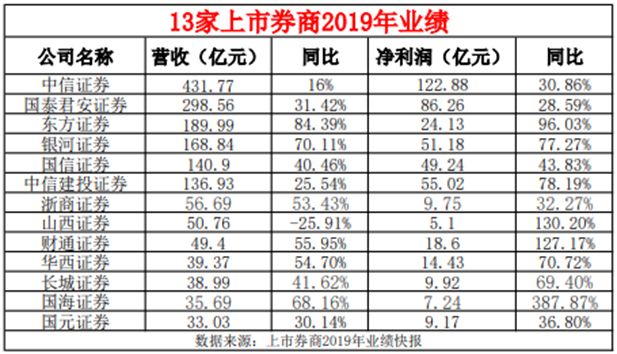 13家券商公布2019年业绩快报