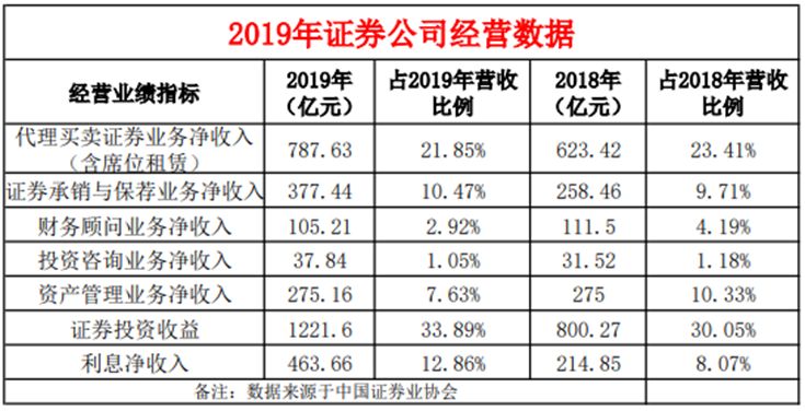 与此同时,经纪业务、资管业务等板块占比逐渐缩小,其中经纪业务占比近五年来持续下降,2019年,代理买卖证券业务净收入(含席位租赁)达787.63亿元,占全年营收的比例为21.85%,而2018年这个数字为23.41%,2017年、2016年、2015年这一数字分别为26.37%、32.10%、46.79%。2019年,券商实现资管收入275.16亿元,对营收贡献为7.63%,较上一年下降近三个百分点。