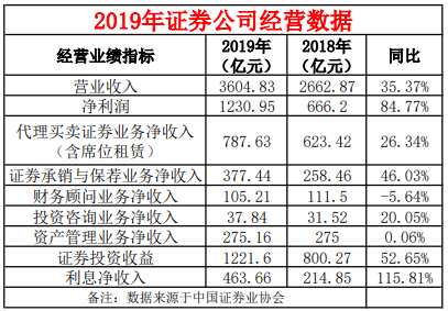 近日,中国证券业协会对证券公司2019年度经营数据进行了统计。证券公司未经审计财务报表显示,133家证券公司2019年度实现营业收入3604.83亿元,同比上升35.37%,实现净利润1230.95亿元,同比大增84.77%。
