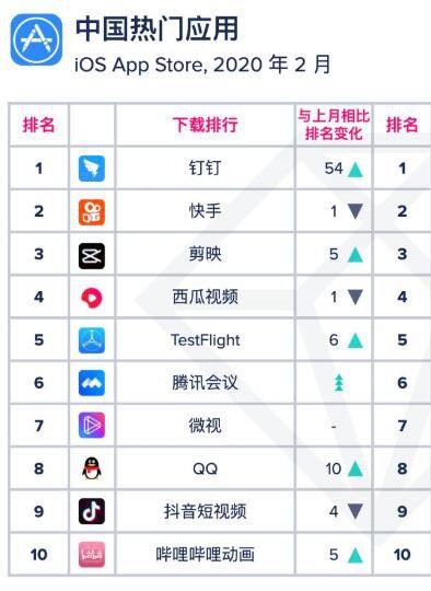 移动数据分析机构APP Annie近日公布了2020年2月指数排行显示,钉钉在中国IOS应用中的下载量由1月的第54名跃升到2月末的第一名;此外,腾讯旗下的腾讯会议也强势跃入下载量十强名单,排名第六。