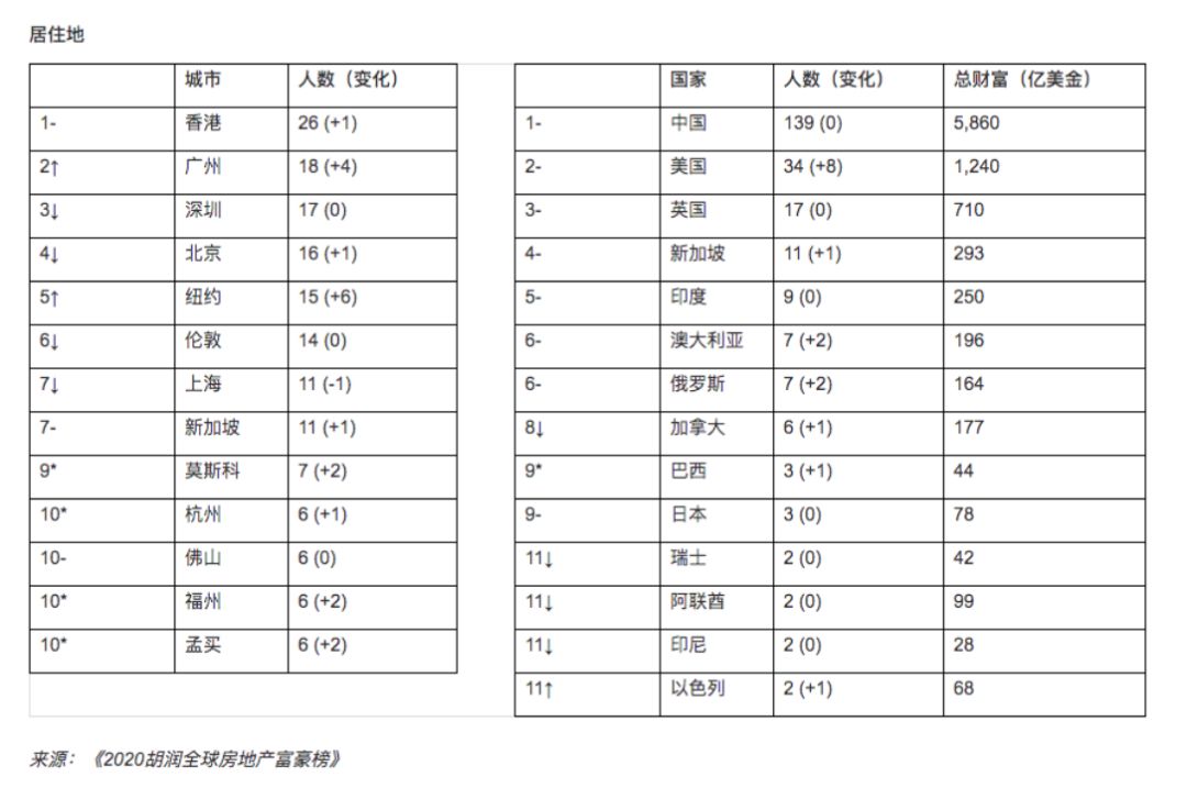以城市来看,香港以26位排名第一,18人定居广州,还有17人来自深圳。纽约是唯一一个进入前五名的非中国城市。