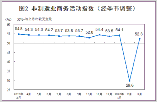 3月份,非制造业商务活动指数为52.3%,比上月回升22.7个百分点。