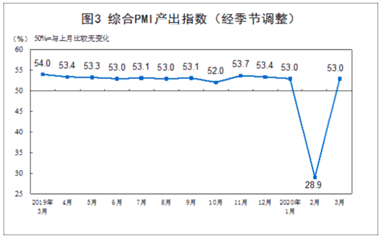 3月份,综合PMI产出指数为53.0%,比上月回升24.1个百分点,表明我国企业生产经营活动总体恢复较快。