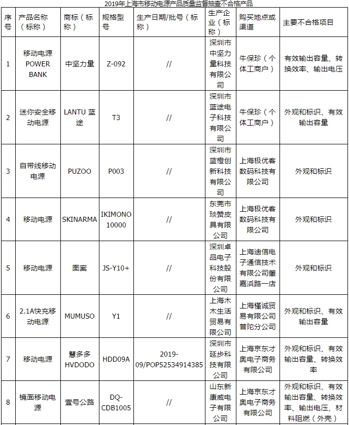 上海市市场监督管理局网站17日公布《2019年上海市移动电源产品质量监督抽查结果》显示,近期,上海市市场监督管理局对本市销售的移动电源产品质量进行了监督抽查,本次抽查了30批次产品,经检验,不合格11批次。