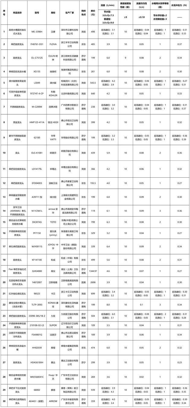 水嘴的节水性能指标包括流量、流量均匀性以及水嘴用水效率等级,此次试验参考标准依据GB 18145-2014《陶瓷片密封水嘴》和GB 25501-2010《水嘴用水效率限定值及用水效率等级》,结果显示30款样品流量、流量均匀性以及水嘴用水效率等级均符合标准。