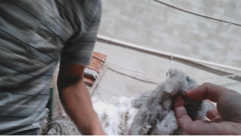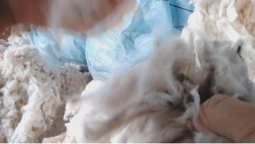 在河南省新密市的温商棉业,集中着近百家棉花加工企业,走进一家工厂车间,这里正在加工再生棉,记者注意到,棉絮状的原料里充满了灰尘,除了部分化纤看上去很白,其余的原料有的发黄,有的发黑,有的甚至已经黏成一团。