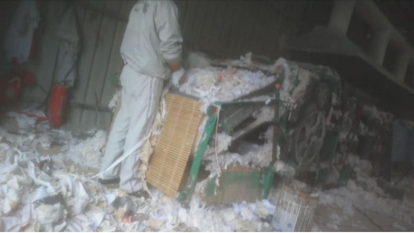 没有经过任何消毒程序,旧衣服被放入机器切成碎片,脏乱不堪地堆放在地上。经过机器绞碎、几道开花程序,旧衣服重新变成了棉花,由于衣服本身有各种颜色,开出来的成品棉花看上去不是特别白,而且里面充满灰尘和杂质。