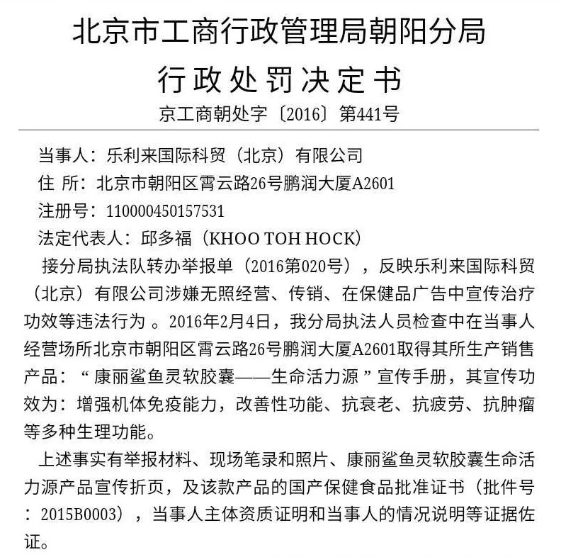 事实上,乐利来国际此前就曾因产品虚假宣传问题,遭到过市场监管部门的处罚:2016年5月4日,北京市工商局朝阳分局因乐利来国际科贸(北京)有限公司“发布含有表示功效、安全性的断言或者保证的保健食品广告”,依据《中华人民共和国广告法》第五十八条的规定进行处罚16000元。