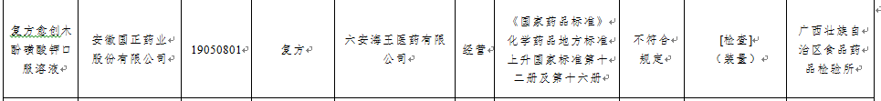 7月23日,国家药监局发布的《关于25批次药品不符合规定的通告》显示,广西壮族自治区食品药品检验所检验,标示生产企业为安徽国正药业股份有限公司生产的复方愈创木酚磺酸钾口服溶液(批号:19050801)不符合规定,不符合项目为[检查](装量),检品来源为六安海王医药有限公司。