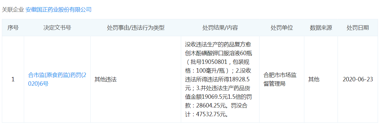 经济日报-中国经济网记者在企查查查询发现,对于标示安徽国正药业股份有限公司生产的上述不合格复方愈创木酚磺酸钾口服溶液,合肥市市场监督管理局已于今年6月23日对生产单位安徽国正药业股份有限公司生产做出以下行政处罚。其一,没收违法生产的药品复方愈创木酚磺酸钾口服溶液60瓶(批号19050801,包装规格:100毫升/瓶);其二,没收违法所得18928.5元;其三,处违法生产药品货值金额19069.5元1.5倍的罚款,即28604.25元,罚没合计47532.75元。