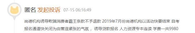 据投诉平台上一位尚德教育学员介绍,2019年11月23日报名了尚德教育英语专科,课程总费用6780元,报名前尚德客服以报名仅剩最后两天的说辞,催促办理了入学手续。在之后的课程中,教学内容让人感觉很死板,上课仅对着教学内容念一遍。此用户与2020年7月14日申请退费,但是售后告知不符合协议退费条件,可是这份协议报名之前并没有告诉自己。