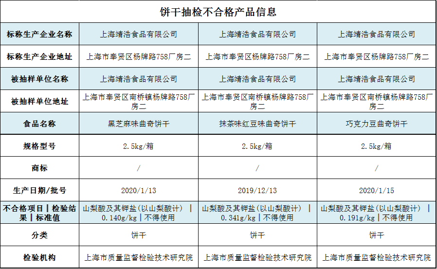 据上海市市场监督管理局网站发布的第30期省级食品安全抽检信息,日前,上海市市场监督管理局对8大类、704批次食品进行了抽检,其中合格701批次、不合格3批次。3批次不合格食品系上海靖浩食品有限公司生产的三款饼干,不合格项目为山梨酸及其钾盐(以山梨酸计)。