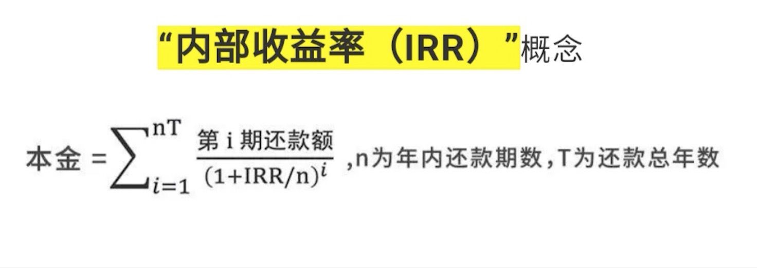 2019年12月,人民银行推进“明示年化利率”的工作,要求各商业银行、互联网金融平台等必须在相关贷款产品中明确展示年化利率,帮助消费者了解真实借款成本,并明确利率的核算方式应为IRR算法。IRR算法为: