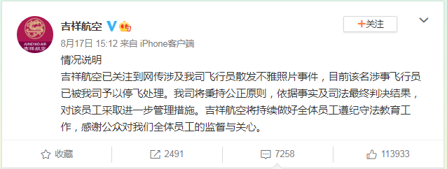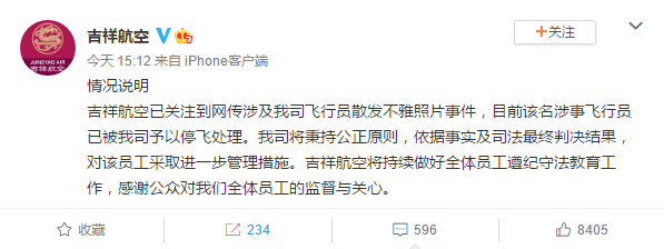 此前,吉祥航空已就“飞行员散发不雅照事件”进行回应并表示:“吉祥航空已关注到网传涉及我司飞行员散发不雅照片事件,目前该名涉事飞行员已被我司予以停飞处理。我司将秉持公正原则,依据事实及司法最终判决结果,对该员工釆取进一步管理措施。吉祥航空将持续做好全体员工遵纪守法教育工作,感谢公众对我们全体员工的监督与关心。”