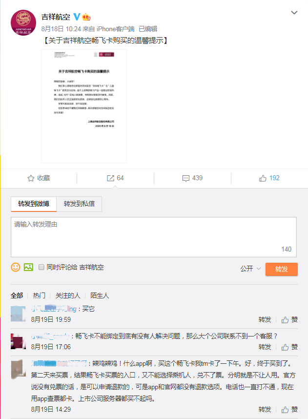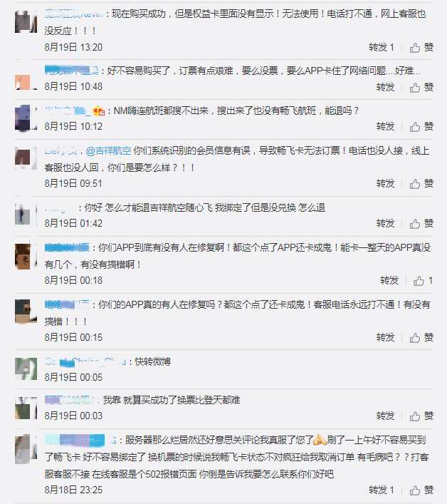 不过中国网财经注意到,在吉祥航空发布的这条微博评论下,网友怨言颇多。多位网友通过转发微博并评论的方式表达不满。有网友表示“购买成功,但是权益卡里面没有显示!无法使用!电话打不通,网上客服也没反应!”还有网友评论称“吉祥航空系统识别的会员信息有误,导致畅飞卡无法订票,电话也没人接,线上客服也没人回”……